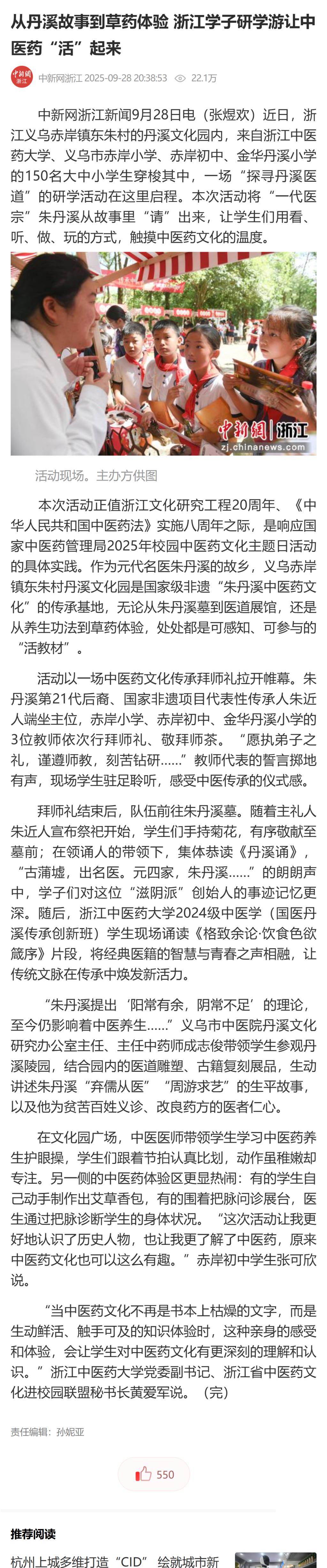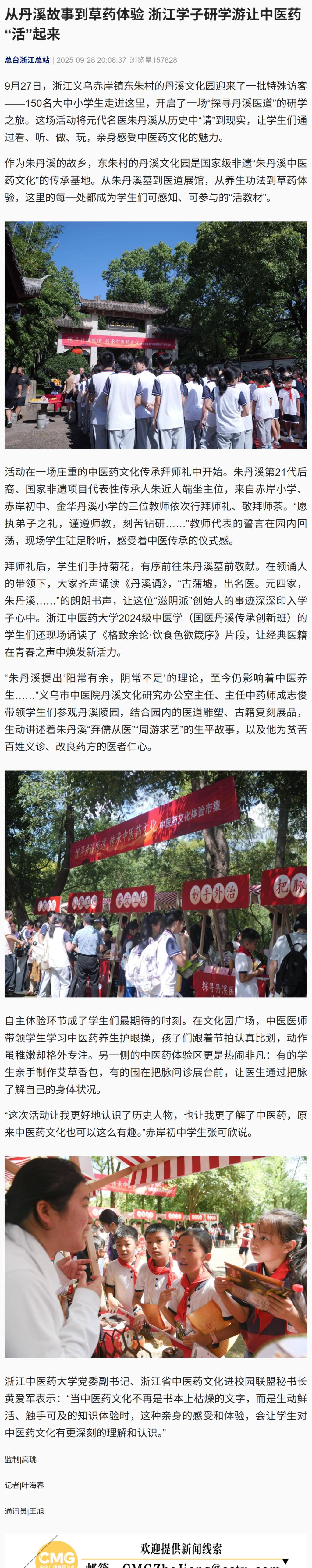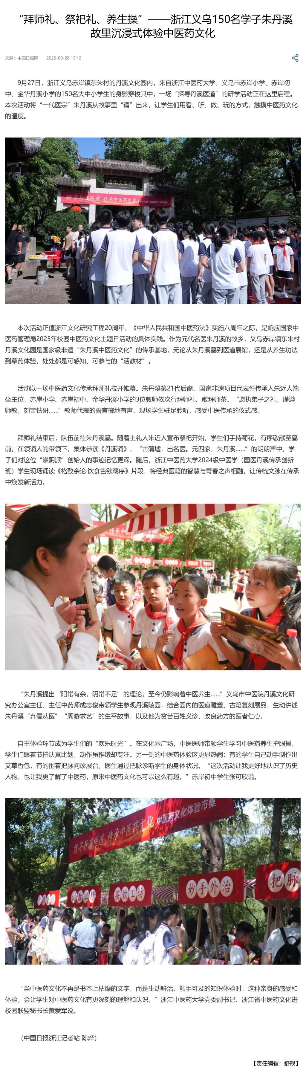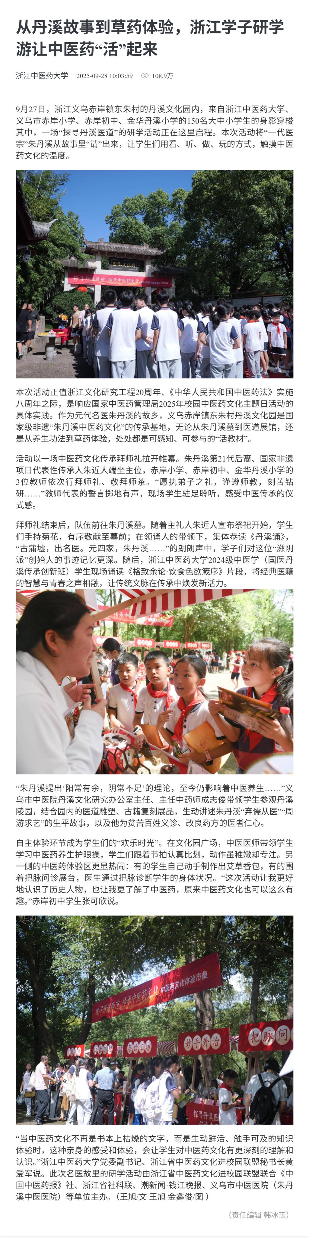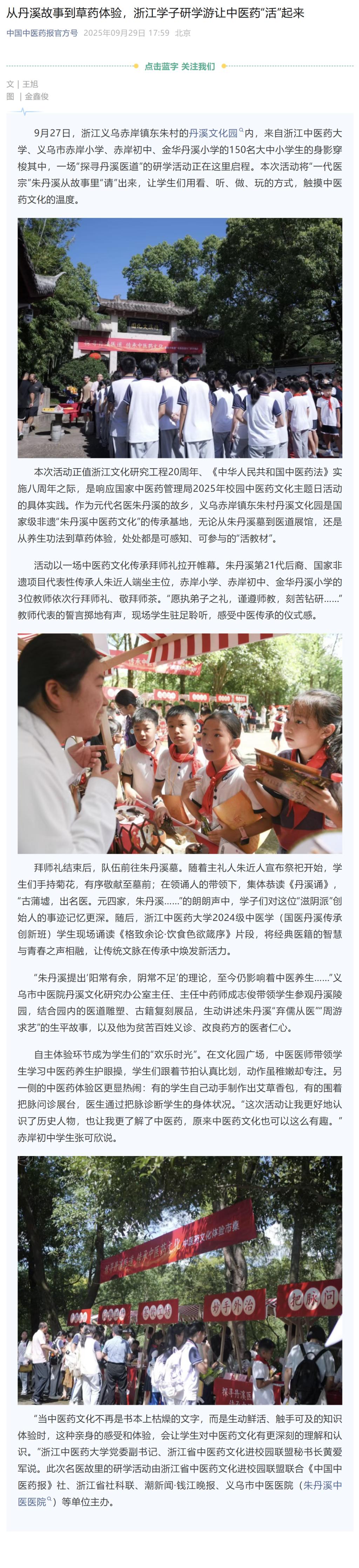 新华网、中国日报网、央视新闻、中新网、中国中医药报:从丹溪故事到草药体验,浙江学子研学游让中医药“活”起来
